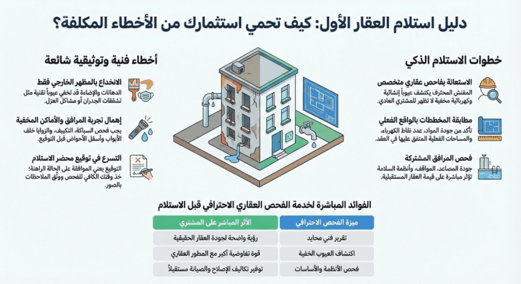 في هذا المقال نستعرض أهم أخطاء استلام العقار لأول مرة وكيف يمكنك تجنبها لضمان تجربة شراء آمنة وخالية من المفاجآت.