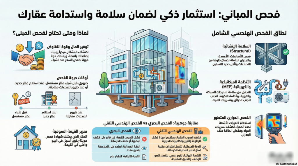 يعد فحص المباني استثماراً ذكياً وليس تكلفة إضافية. سواء كنت مقبلاً على شراء منزل أحلامك أو ترغب في الحفاظ على عقارك الحالي، فإن الاستعانة بالخبراء تضمن لك الحماية من المفاجآت غير السارة وتؤمن لك مستقبلاً عقارياً مستقراً.