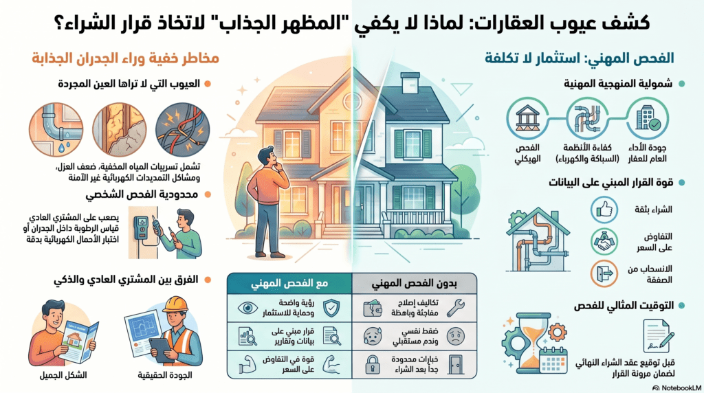 ومن هنا تأتي أهمية كشف عيوب العقارات قبل الشراء، ليس كخطوة إضافية، بل كحاجز أمان يحميك من قرارات قد تندم عليها لسنوات.