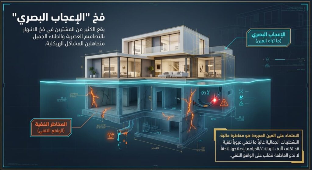 كثير من المشترين يقعون في فخ “الإعجاب البصري”، حيث ينبهرون بالتصاميم والتشطيبات الظاهرية، متجاهلين المشاكل الهيكلية أو التقنية التي قد تكلفهم مبالغ طائلة لاحقاً.
