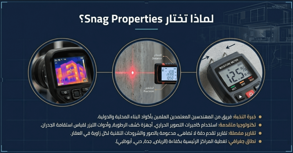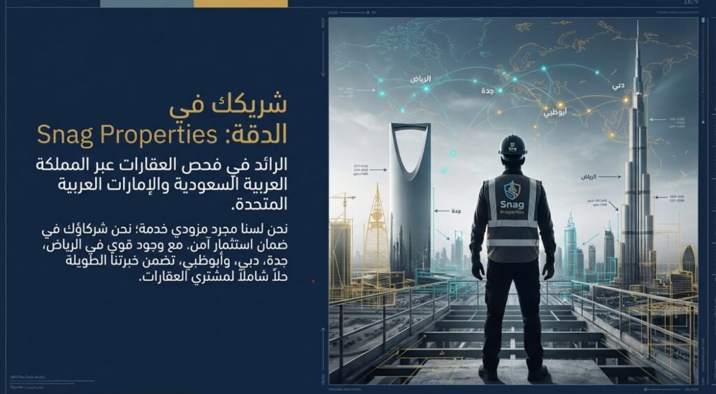 عندما نتحدث عن الاحترافية والدقة في معاينة العقارات، يبرز اسم شركة سناغ للممتلكات (Snag Property) كقائد في هذا المجال. بفضل خبرتها الطويلة وتواجدها القوي في السوقين السعودي والإماراتي، تقدم الشركة حلولاً متكاملة تضمن للمشتري الحصول على تقرير وافٍ وشامل.