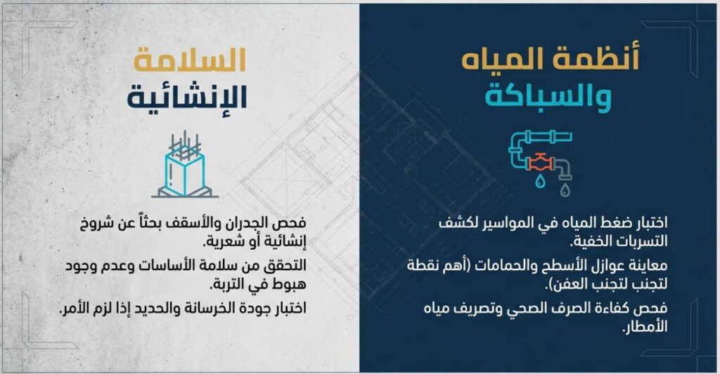 • معاينة عوازل الأسطح والحمامات (أهم نقطة لتجنب الرطوبة والعفن).