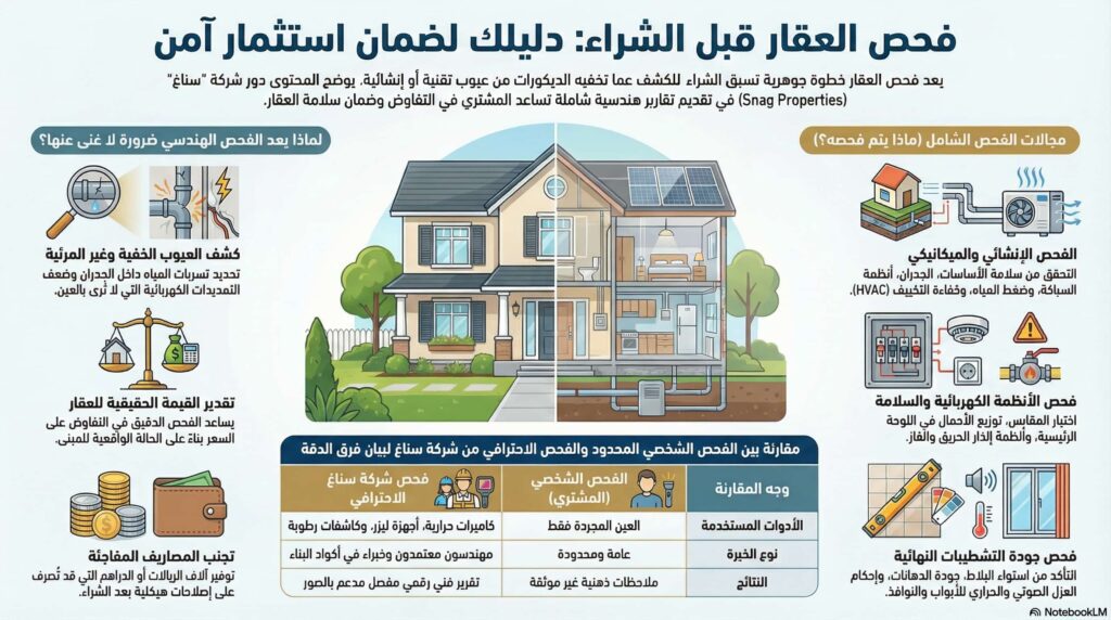 • تقدير القيمة الحقيقية: الفحص الدقيق يساعدك في التفاوض على السعر بناءً على حالة العقار الواقعية.
